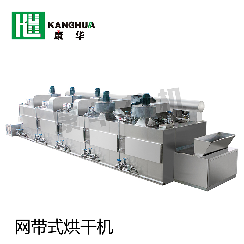 網(wǎng)帶式干燥機(jī)工作時(shí),冷空氣通過(guò)熱交換器進(jìn)行加熱,采用科學(xué)合理循環(huán)方式,使熱空氣穿流通過(guò)網(wǎng)帶上的被干燥物料進(jìn)行均勻的熱質(zhì)交換,整機(jī)各單元內(nèi)熱氣流在循環(huán)風(fēng)機(jī)的作用下進(jìn)行熱風(fēng)循環(huán),排出低溫高濕度的空氣。平穩(wěn)高效地完成整個(gè)干燥過(guò)程。