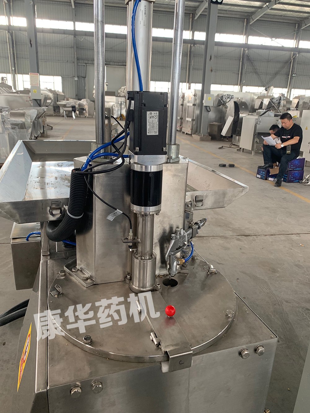 工作原理:將物料放入相應(yīng)進(jìn)料斗,氣缸自動壓料,切刀固定于轉(zhuǎn)盤正面,轉(zhuǎn)盤與切刀的合適間隙通過伺服電機控制刀盤上下調(diào)節(jié),當(dāng)電機帶動刀盤,將物料切成片狀。配有水槍噴霧裝置,使刀片切制藥材不容易粘刀,片形更好。